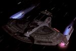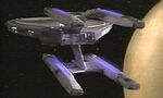 This ship design has an angular saucer-shaped hull. Like the Saber class, the Steamrunner has two warp nacelles embedded in the saucer.