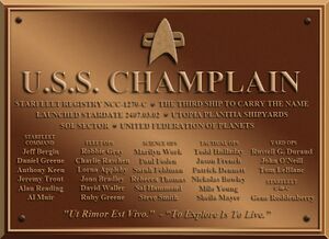 The USS Champlain was a starship of the Galaxy Class Variant. She was assigned to the 52nd Fleet, where her primary mission was to explore the areas of space surrounding the sector controlled by the 52nd Fleet.