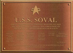 The USS Soval is a refitted Galaxy Class starship currently serving in the Starfleet of the United Federation of Planets. The ship was first launched in 2384 under the name USS Dakota. In 2412, the ship was removed for an extensive retrofit of its system. After two years, the ship returned to service in 2414 and was assigned to the 781th Squadron assigned to Starbase 989 to continue exploration of sector 6309 like, among many, the USS Starfire and USS Rosenante before it.